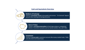 - Medium of Exchange–We use cash to pay expenses and execute transactions “on demand” with no need to wait for funds. The priority here is immediate access.